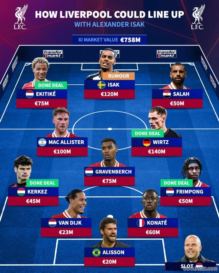 7月24日讯 利物浦刚刚官宣埃基蒂克,而多方消息确认, 法甲新闻网伊萨克已经告知纽卡希望离队, 足球快讯高清直播《转会市场》也据此预测了红军新赛季主力阵形 。
