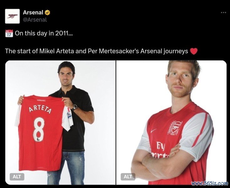 8月31日讯 在2011年的今天,现任球队主帅阿尔特塔以及默特萨克开启了枪手生涯,阿森纳官推也晒出两人当时的照片作为纪念。