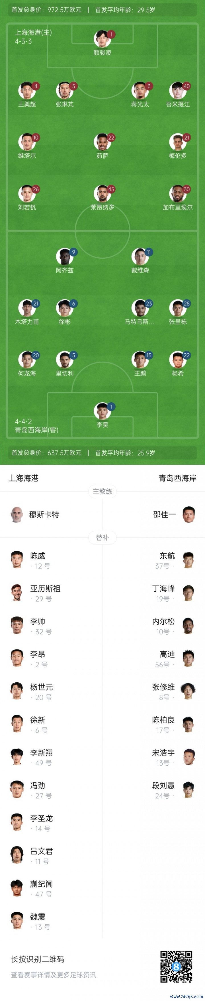 07月26日讯 北京时间今晚19点,中超第18轮,上海海港vs青岛西海岸五洲特纸,杆位阵形 出炉!