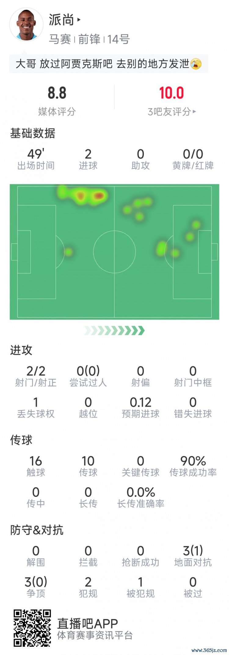 10月1日讯 在本轮欧冠马赛对阵阿贾克斯的赛事 中,派尚连进两球。