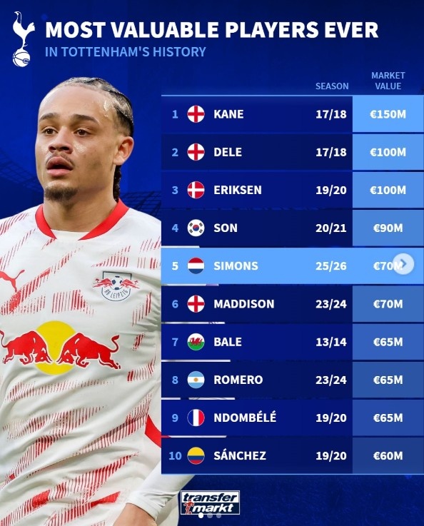 5、哈维-西蒙斯(2025-26赛季):7000万欧元