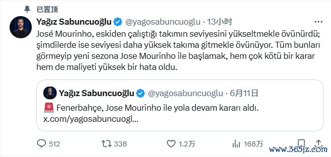 土耳其名记Yağız Sabuncuoğlu发文批评穆里尼奥并置顶推文:穆里尼奥曾经经常以提升球队水平为荣,如今他却以加盟更高水平的球队自夸。