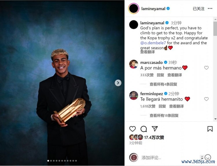 9月23日讯 亚马尔更新社媒动态,庆祝获得科帕奖,并祝贺登贝莱斩获金球奖。