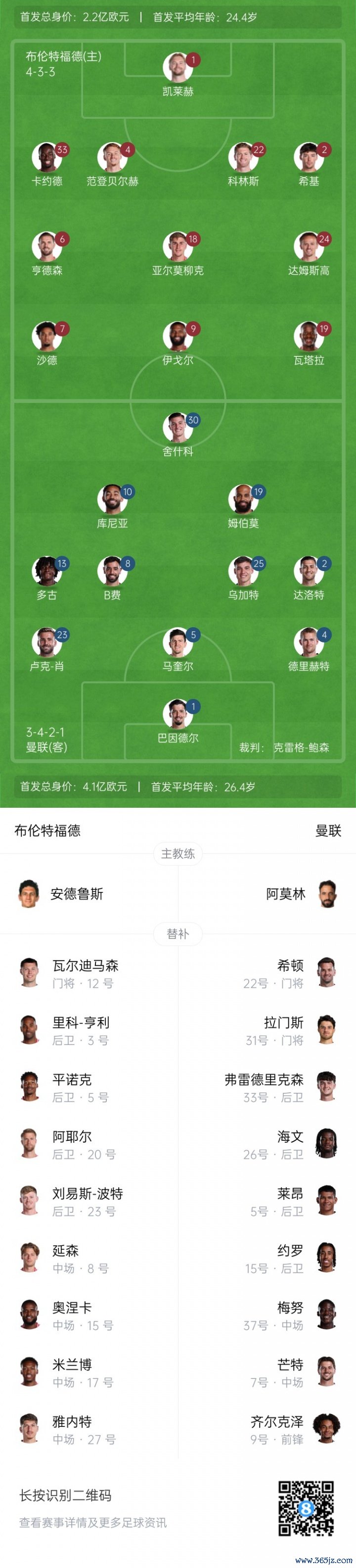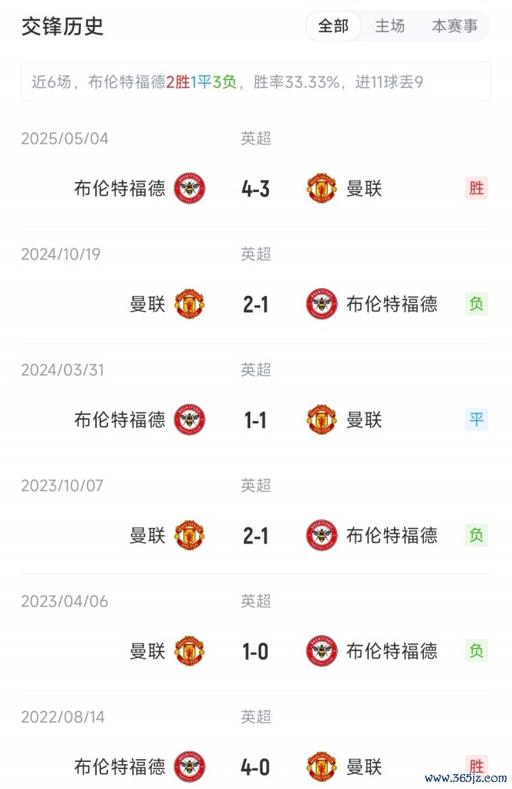 截至赛前,曼联2胜1平2负积7分,排名英超积分榜第11;布伦特福德1胜1平3负积4分,排名英超积分榜第17。