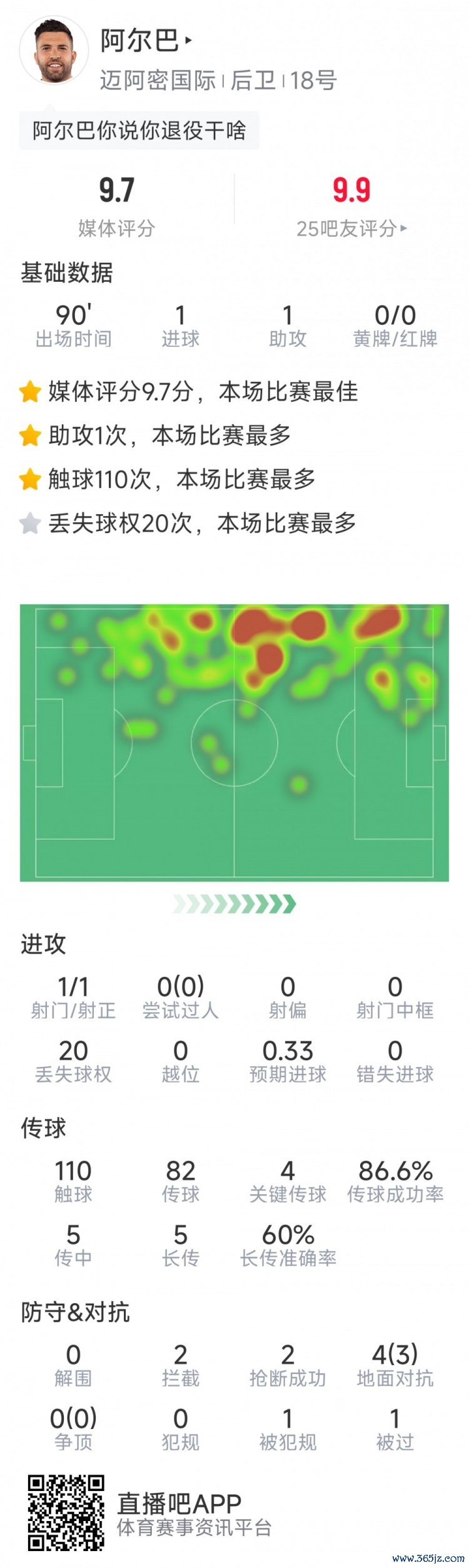 10月12日讯 在美职联补赛,迈阿密国际4-0大胜亚特兰大联,极限运动视界五大联赛此前宣布赛季末退役的阿尔巴表现出色, 法甲新闻网以下为他在本场数据:
