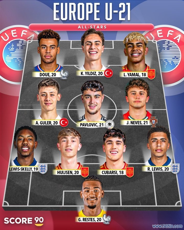 10月13日讯 Score 90评选了欧洲U21年龄段的明星赛阵形 ,亚马尔、若昂-内维斯领衔, 法甲新闻网其中西班牙三人, 足球快讯五大联赛土耳其、法国、英格兰各两人,极限运动视界葡萄牙、德国各一人。