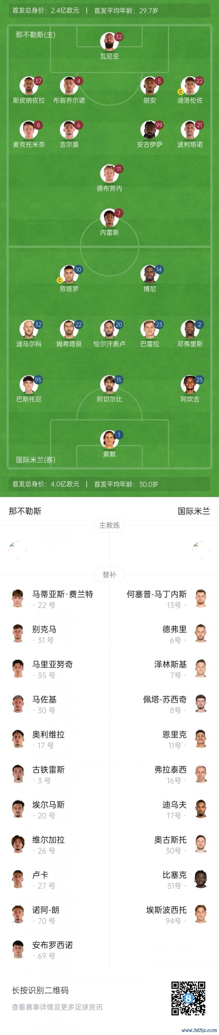 那不勒斯后备 :25-费尔兰特、55-斯皮内利、3-古铁雷斯、17-奥利维拉、20-埃尔马斯、26-贝尔加拉、27-洛伦佐·卢卡、30-马佐基、31-别克马、35-马里亚努奇、69-安布罗西诺、170-诺亚·朗